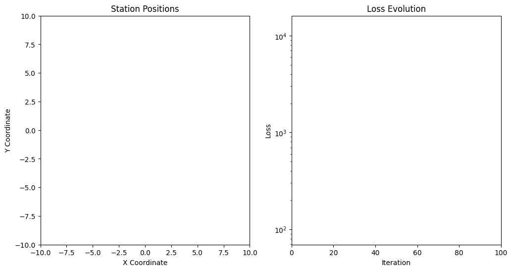 ani = animation.FuncAnimation(fig, update_frame, frames=100, fargs=(positions_record, loss_record, station_names, scat, line, ax1, ax2), blit=False, repeat=False)